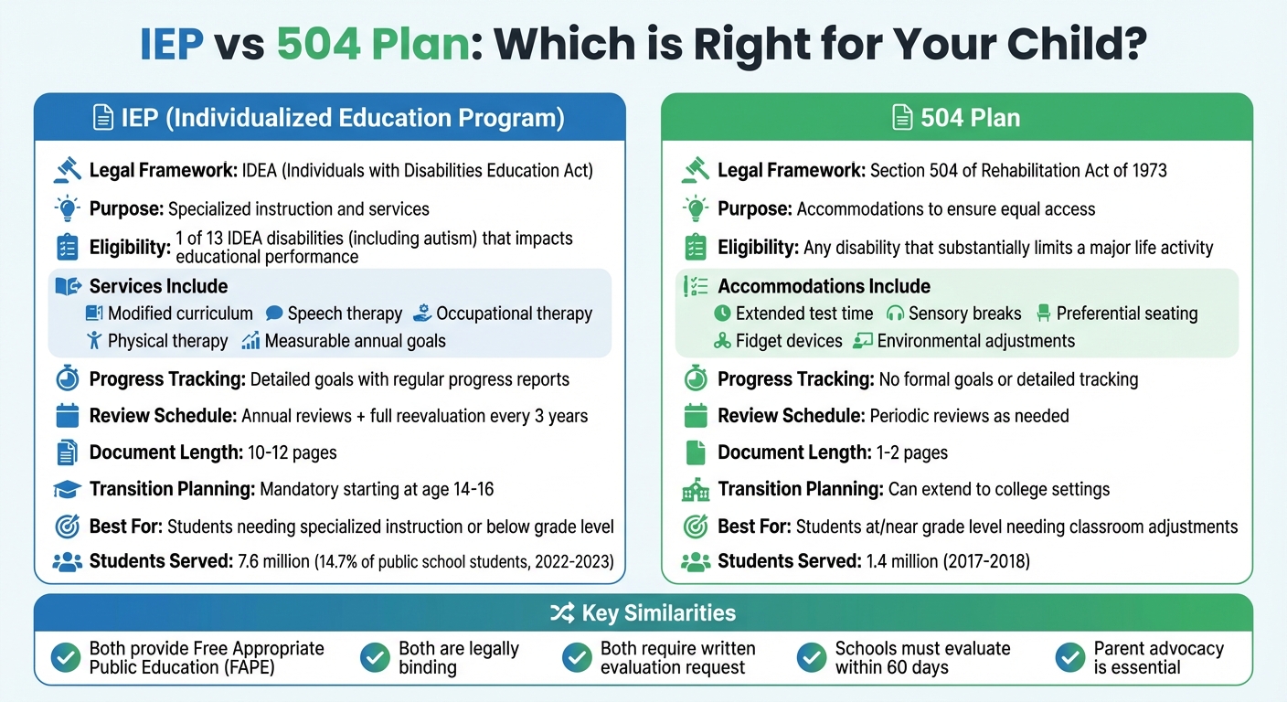 For children who need direct instruction in areas like social skills or self-regulation, an IEP’s structured, goal-oriented framework is ideal. On the other hand, if your child benefits more from environmental changes – like extra time on tests or sensory breaks – a 504 Plan can be a simpler and more efficient solution. This comparison offers a clearer path as you continue advocating for the right support for your child.